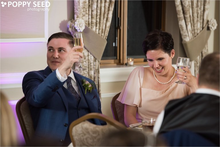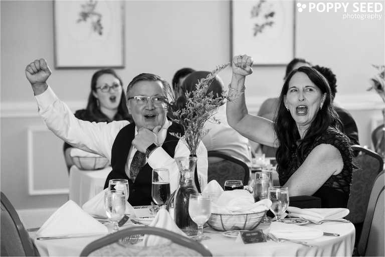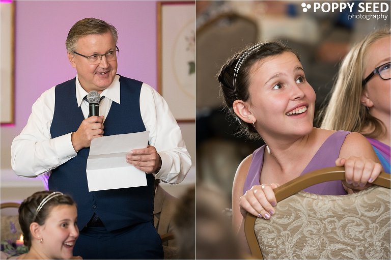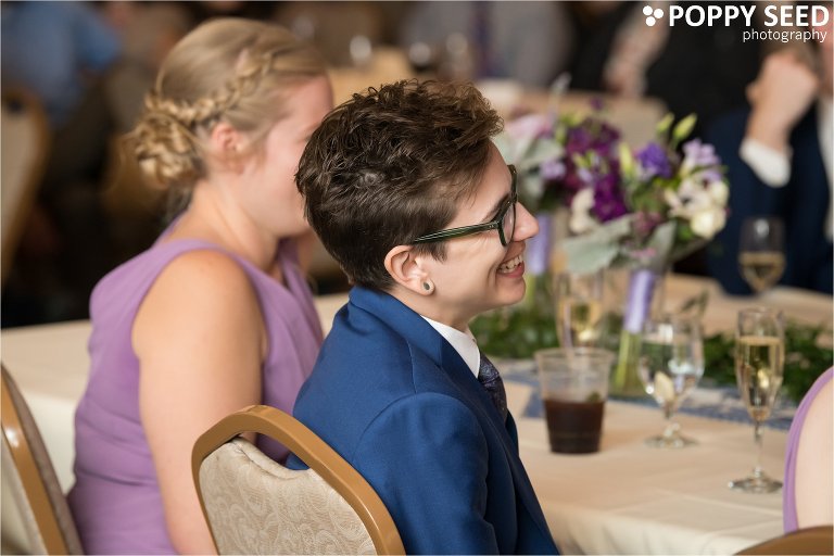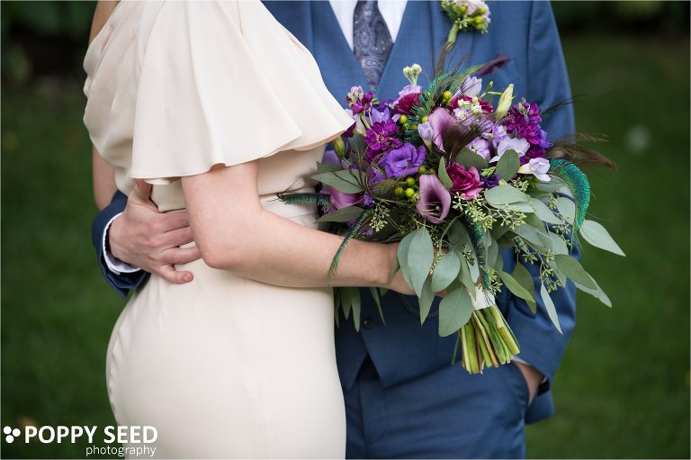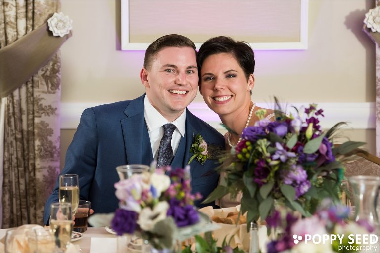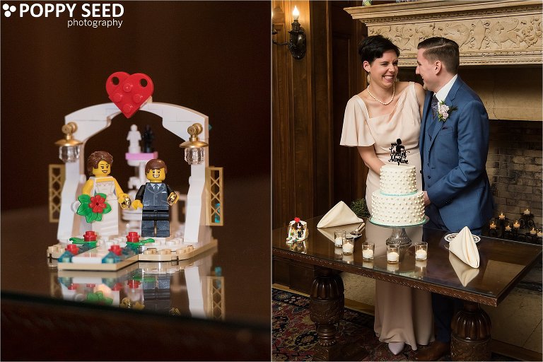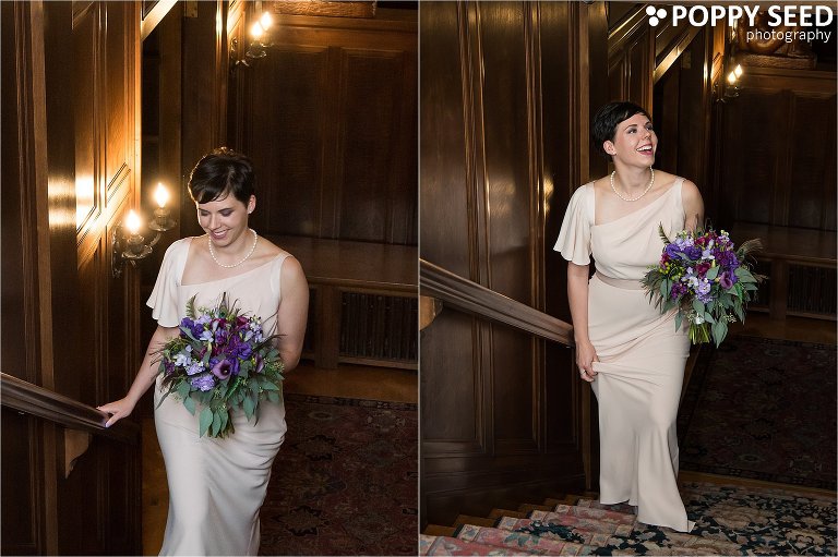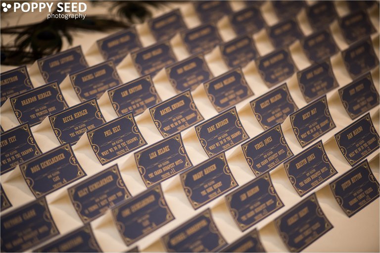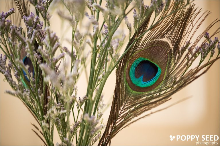 The couple’s wedding at Gale Mansion in Minneapolis took place in early September just over nine years after the couple first started dating. Their movie themed wedding was complete with a lot of personal touches that highlighted their love of movies. Each table setting had a movie reel tin and a movie themed name for the table. Their floral decor included beautiful details of peacock feathers and flowers.